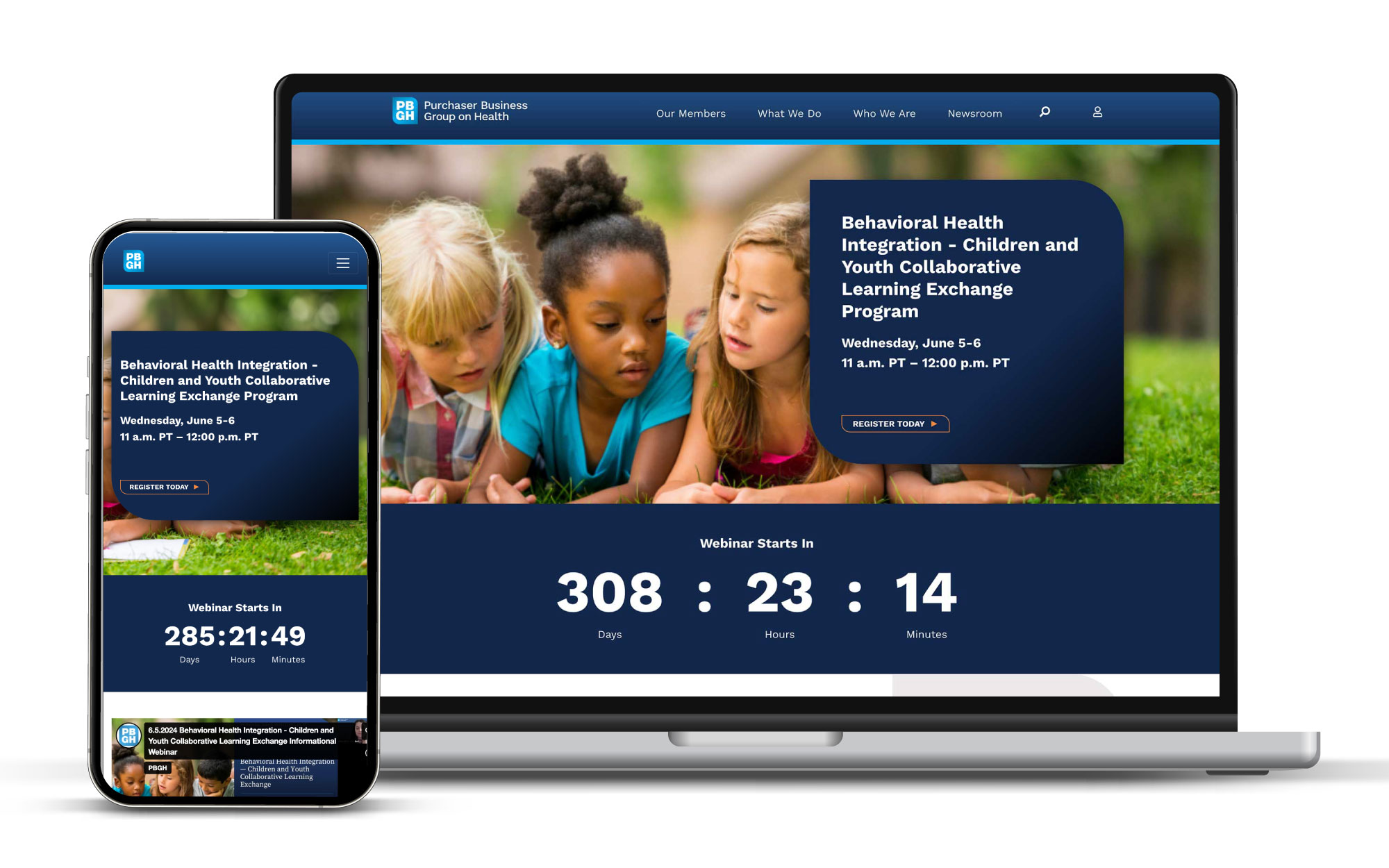 I redesigned the event template for the Purchaser Business Group on Health (PBGH), a nonprofit coalition representing nearly 40 private employers and public entities across the U.S. that collectively spend $350 billion annually on health care services for over 21 million Americans and their families. With a 30-year track record of innovative operational programs, PBGH needed an updated event template to better showcase their webinars and in-person events.