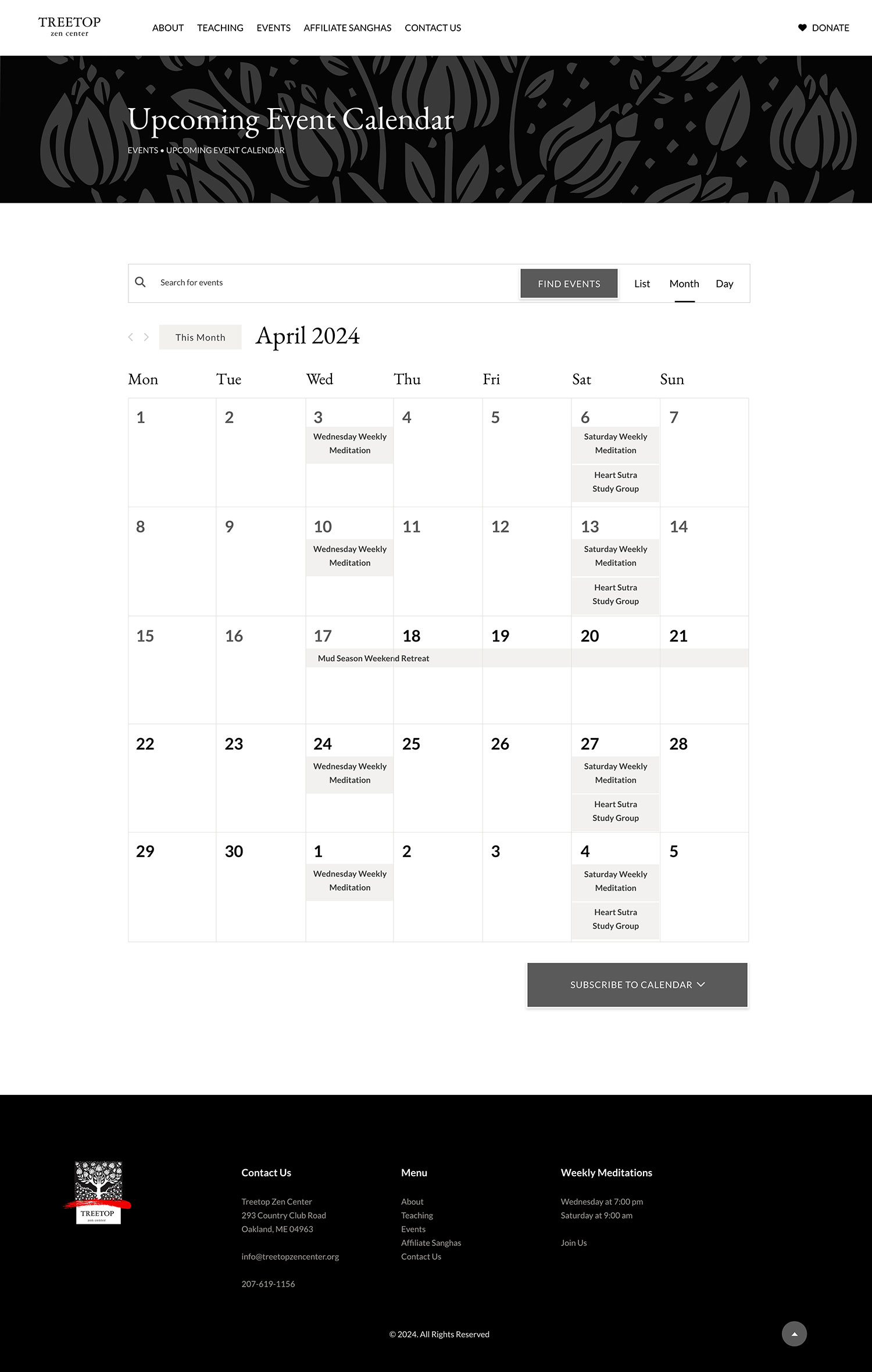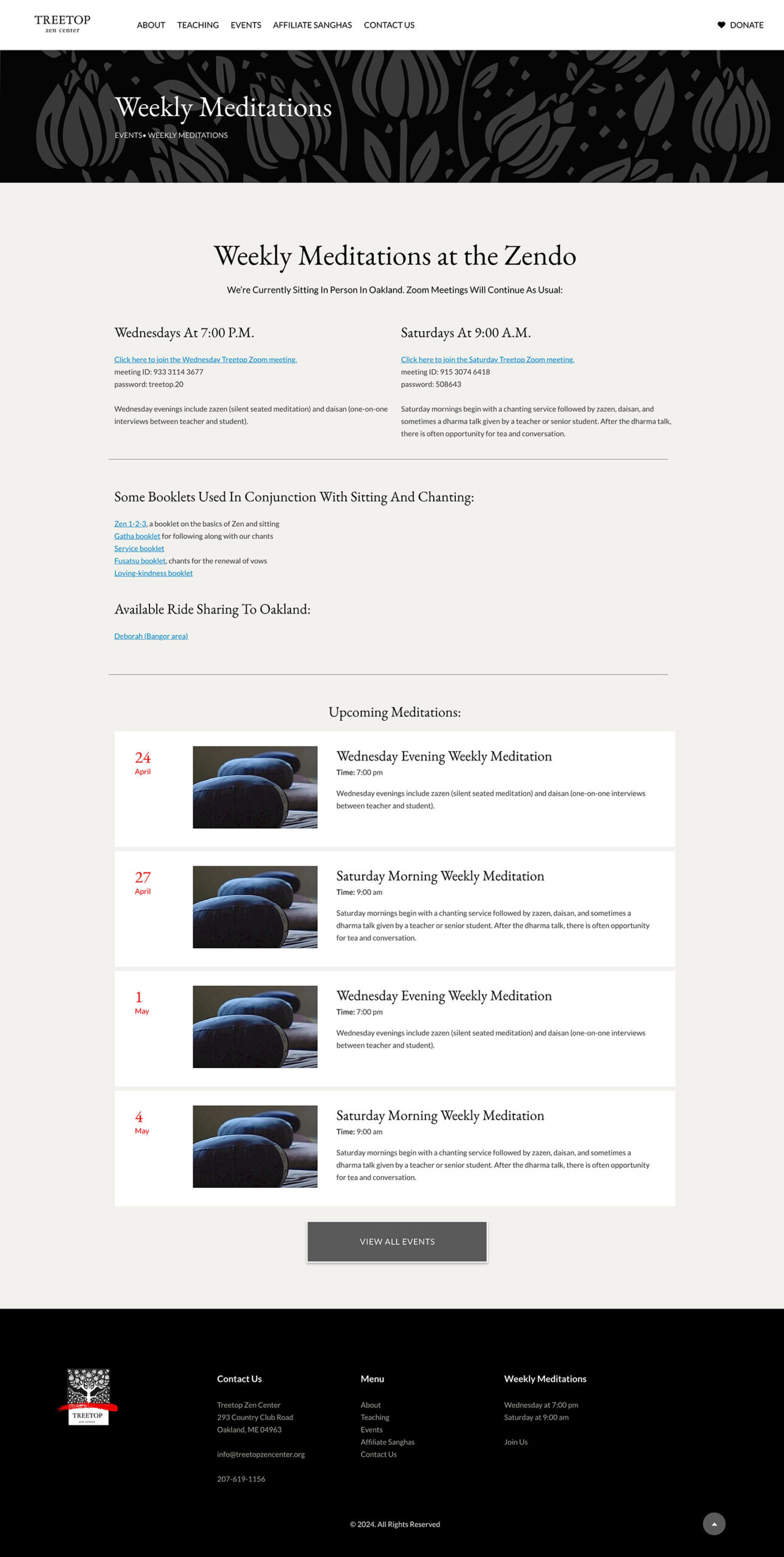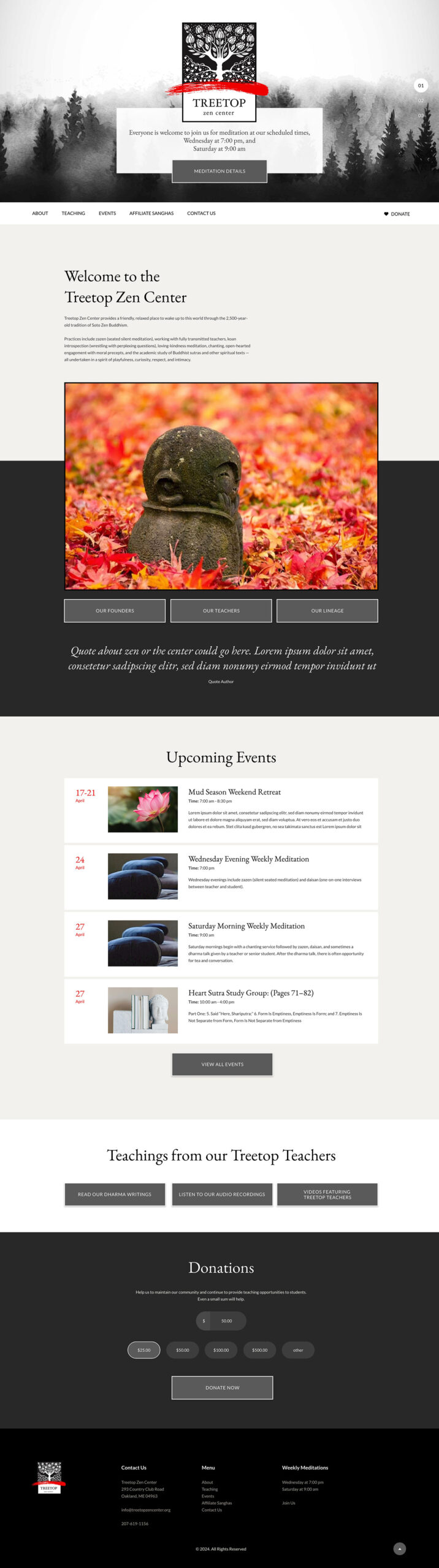 Treetop Zen Center is a small, community-based Zen practice offering weekly meditation sessions, teachings, and in-person gatherings. Their website served a wide range of audiences—from first-time visitors curious about meditation to long-time practitioners relying on the site for up-to-date schedules and events.